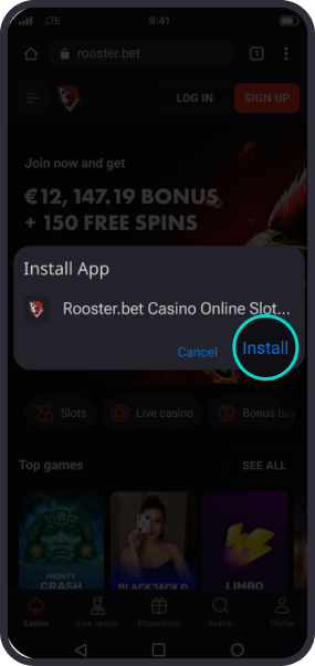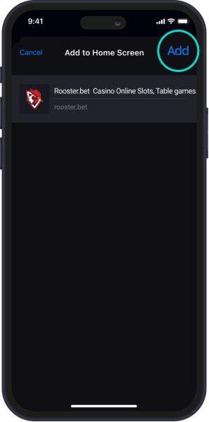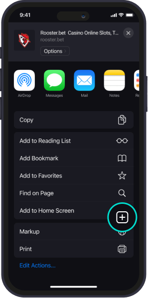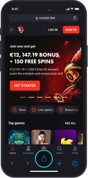 Open rooster.bet with Safari, tap “Share” on the bottom navigation panel